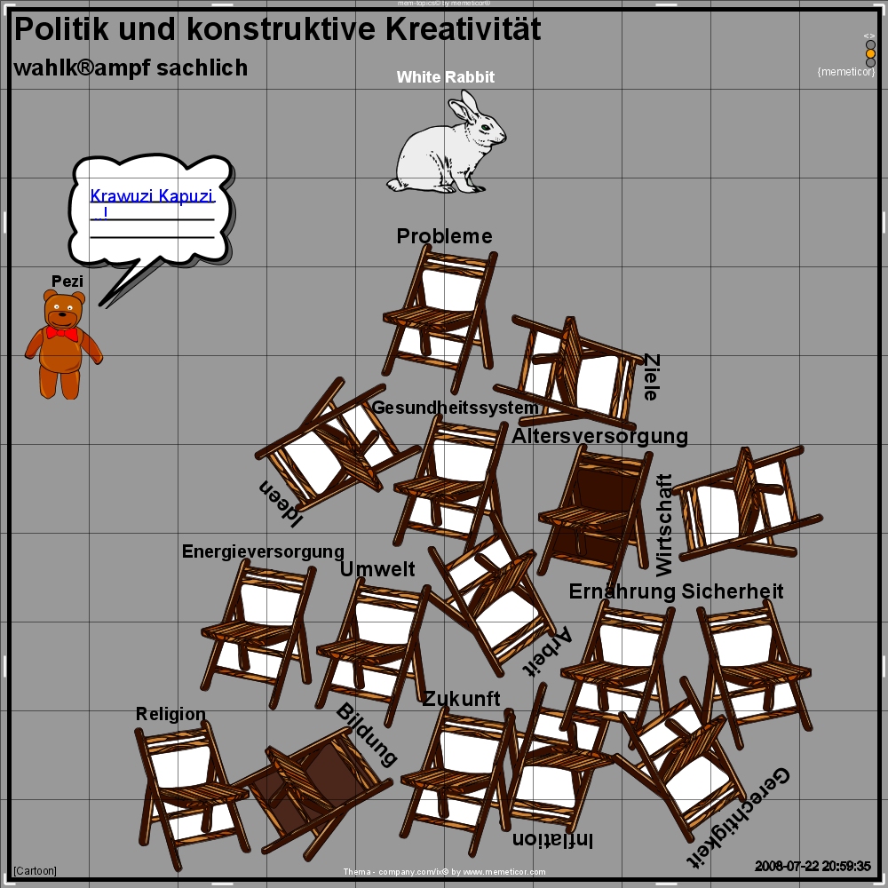 Hier entsteht mit Hilfe von Newslettern die Serie "Politik und konstruktive Kreativität" - wahlk®ampf sachlich, um zu zeigen dass Kreativität durch nichts ersetzt werden kann. Sachthemen werden systematisch graphisch dargestellt und wir suchen kreative Politiker und solche die es noch werden wollen. Und natürlich auch Sponsoren und Presse.